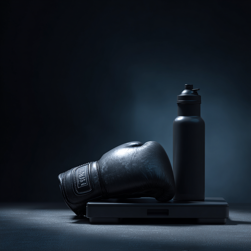 暗い背景の中、ボクシンググローブと水筒が静かに置かれたミニマルな構図。