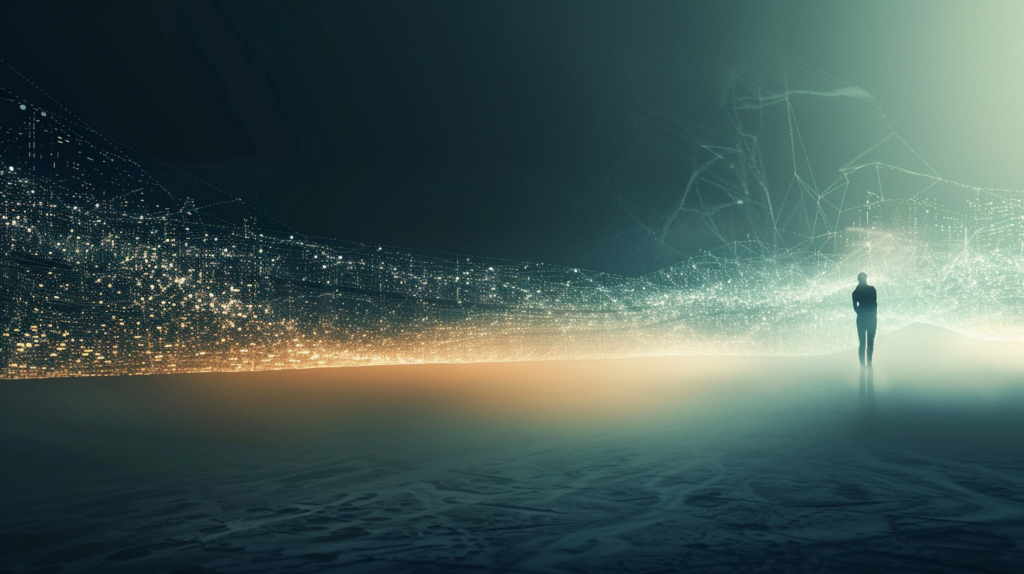 光とデータの地平線の先に、一人立つ人物のシルエット(イメージ)