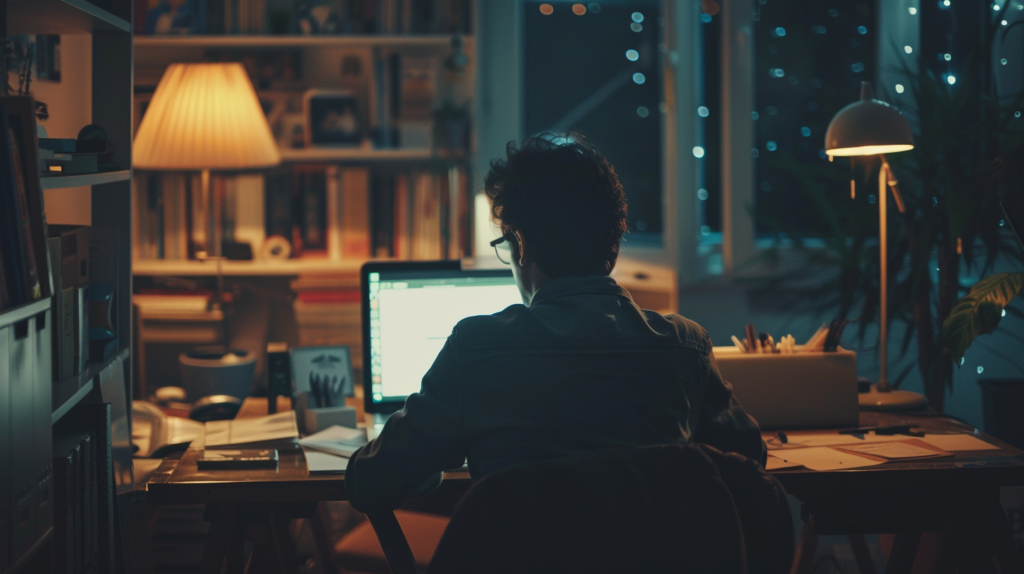 夜のデスクで一人作業するクリエイター。(イメージ)