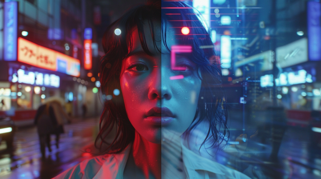 ネオンに満ちた都市で、赤と青に分断された人物の顔。(イメージ)