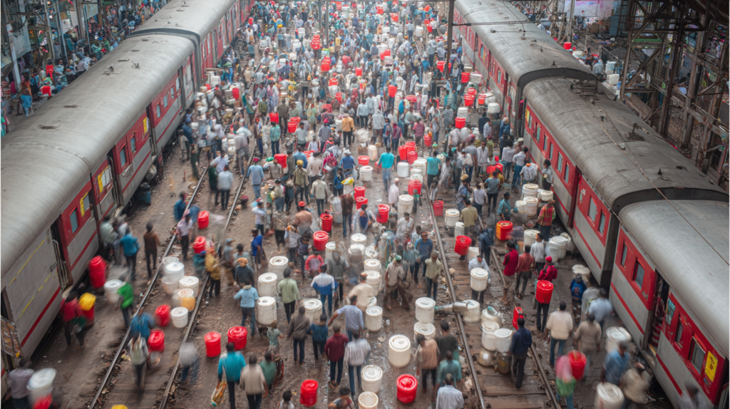 ムンバイ駅でダッバーワーラーがランチボックスを運ぶ様子(人間アルゴリズム物流)