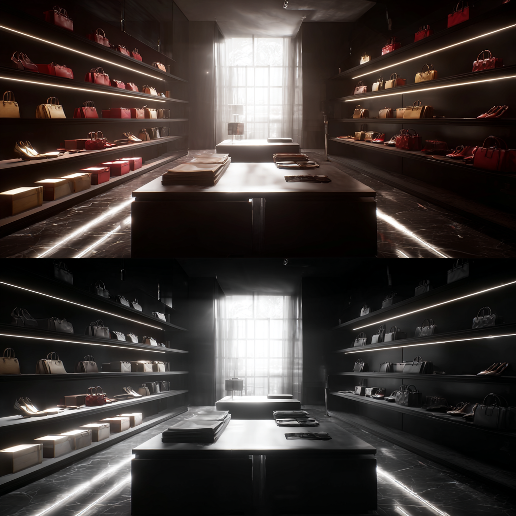 高級ブランド店と通常店舗の対比による商品陳列と空間の違い