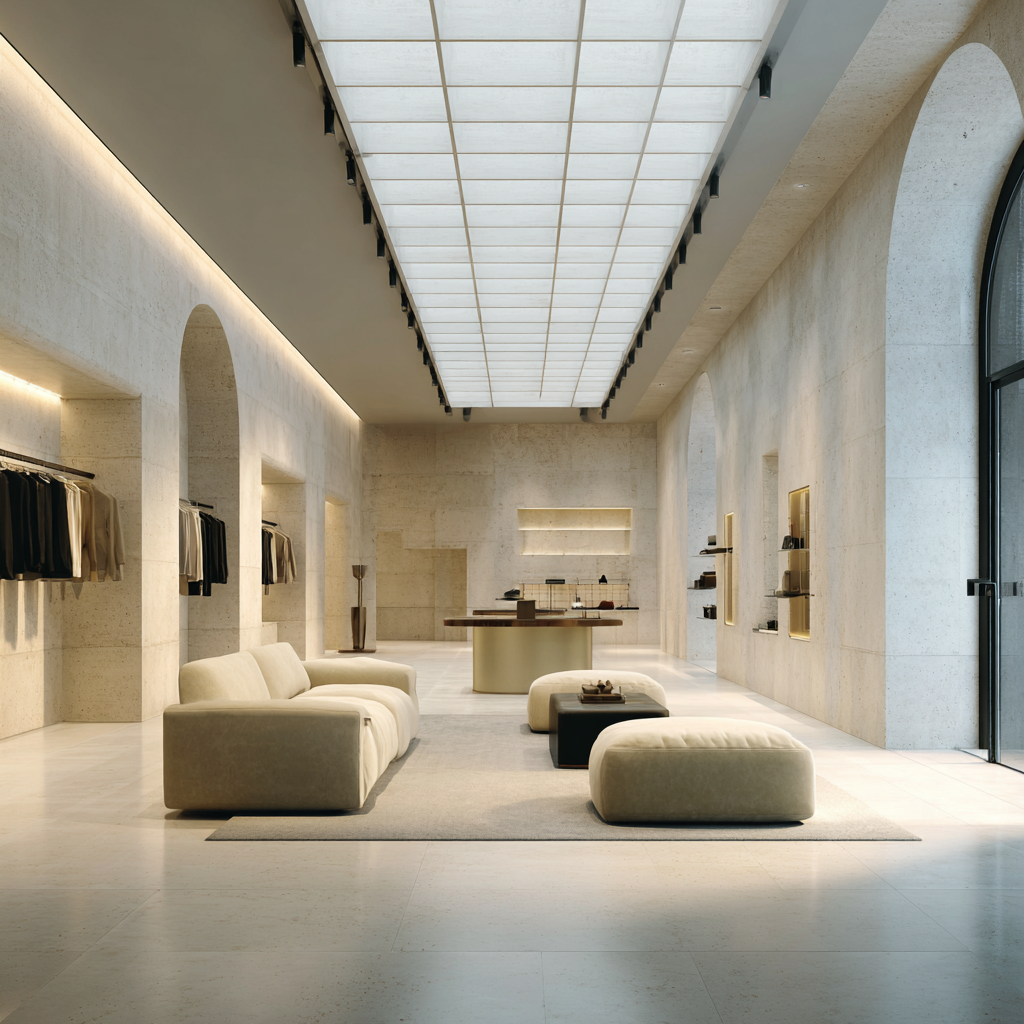 ミニマルで高級感のあるアパレル店舗の内観と落ち着いた空間デザイン