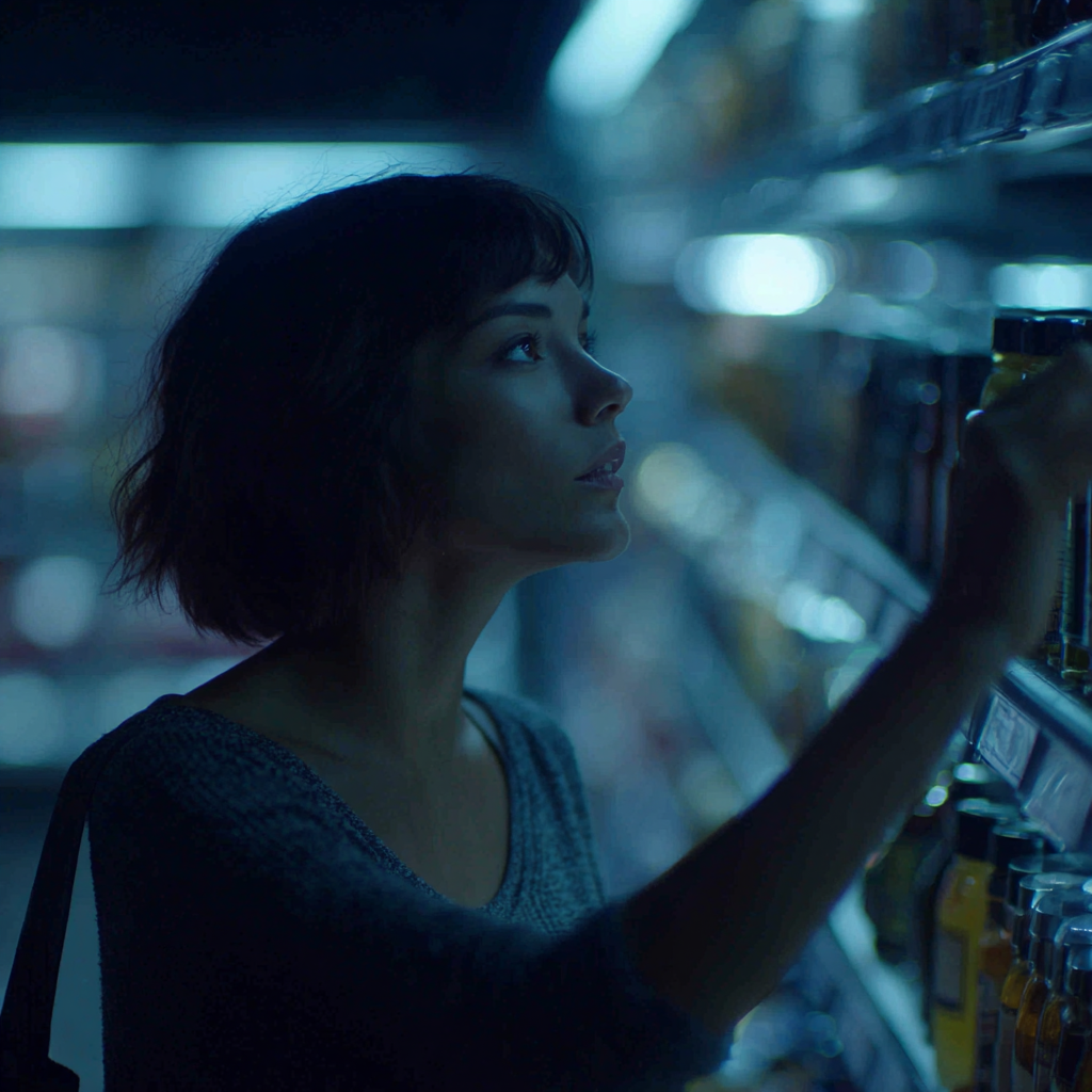 商品棚の前で商品を選ぶ女性の横顔と意思決定の瞬間
