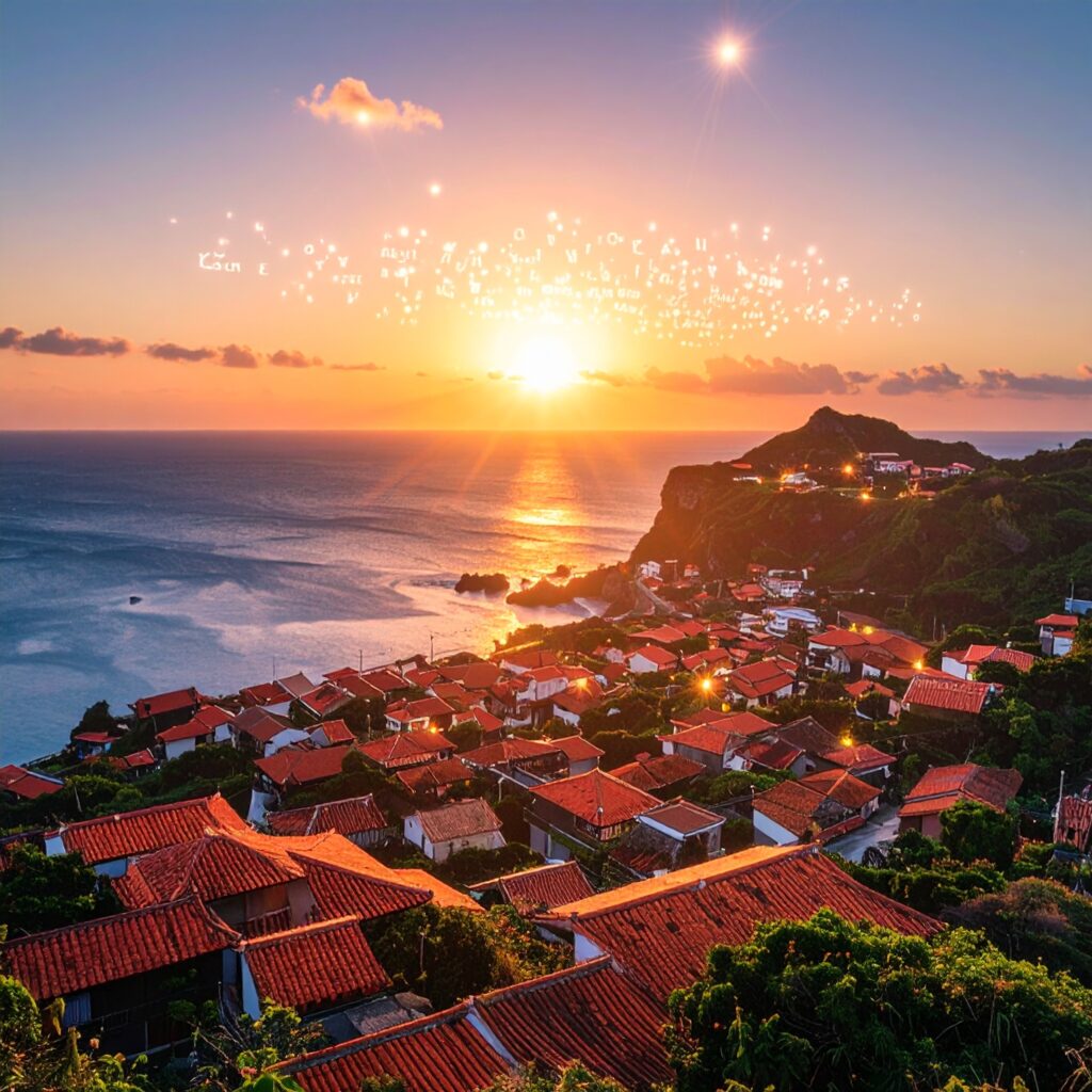 沖縄県の海辺の集落に沈む夕日と、空に浮かぶ光の粒。Soraのフィールドノート第14篇「ことば、海と空に溶けている。」のキービジュアル。