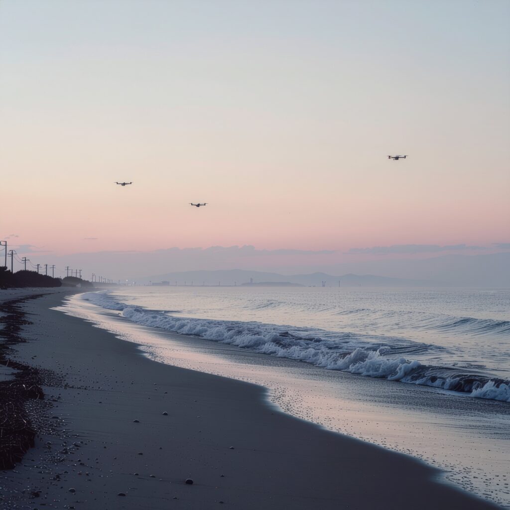 「夕暮れの福島・浜通りの海岸上空を飛行するドローン。静かな波と淡い海霧が広がる“実験場”としての風景。」