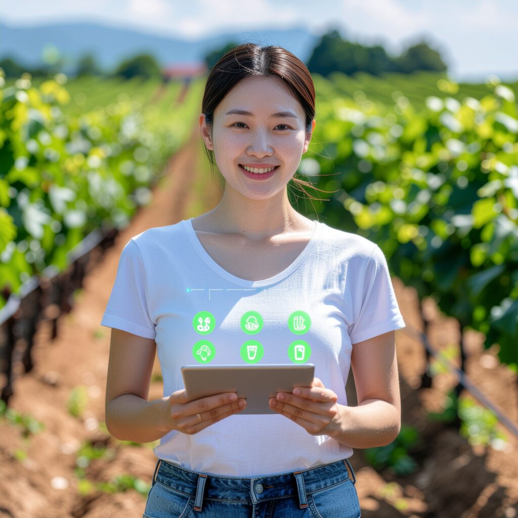 南アルプスからの風が畑を渡っていく。朝露の残る畝の上で、小さなドローンが静かに離陸する。ぶどうの葉の裏側、地温、樹勢、過去の気象データ。見えない情報が、いまや畑の「もう一つの風景」になっている。