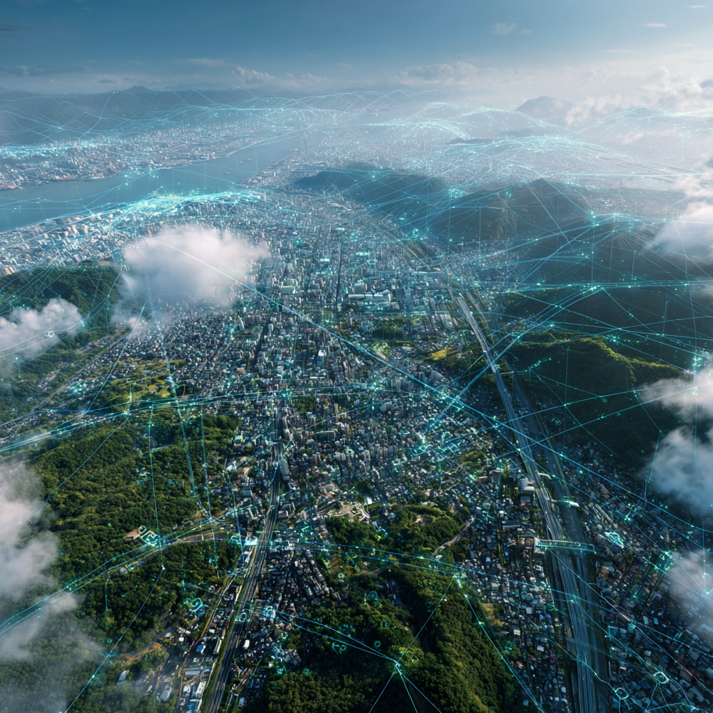 広島の都市と山間地域をデジタルネットワークが結ぶスマートシティのイメージ。ひろしまサンドボックスによる社会実証と都市データの可視化を象徴する風景。