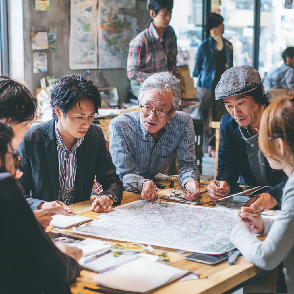 広島県の「ひろしまサンドボックス」を象徴する、市民・起業家・行政関係者が地図を囲んで地域の未来を議論する共創ミーティング