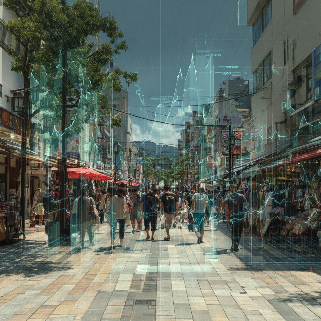 広島の商店街を歩く観光客の人流をデータ可視化したイメージ。
